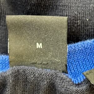 Good preowned condition BOSS Fabello sweater, size medium, black with blue color accent. Classic crew neckline, long sleeves, and pullover style. 100% cotton. Pit to pit is 19 inches. Length is 25.5 inches. Sleeve length is 25 inches from the shoulder seam to end of the sleeve. Item has been worn and washed, fabric lightly pilled as is typical for a knit cotton garment. Slimmer cut, banded hem and sleeves.