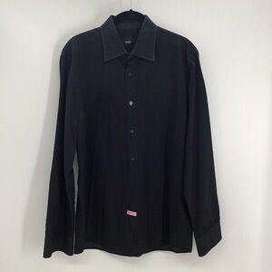 Nice BOSS Hugo Boss casual button -down shirt. This shirt looks like black denim, but it is a lightweight cotton fabric. Unique look! Features button-down front, button cuffs, laid collar & soft cotton fabric.