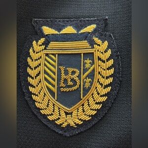 Signature created gold patch on chest pocket. Patch has HB embroidered on it.