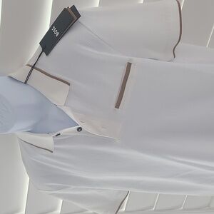 Stylish Boss polo shirt. Crisp textured white fabric. Stylish brown accents. Perfect for any occasion.