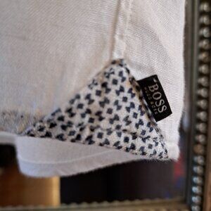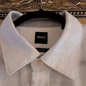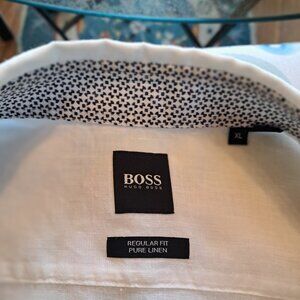 BOSS XL short sleeve 100% linen shirt, very good condition, worn and laundered only once, no sign of wear. Coordinating sleeve binding as well as neck. Also contrast at bottom sides of shirt with BOSS LOGO. Regular Fit