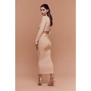 NWT BOSSA Silhouette Champagne Gold Shimmer Kylie Skirt Size, Large. The Kylie skirt is made from ultra feminine figure sculpting Lurex which has a soft radiating glimmer woven through the threads. The shape is designed to streamline the feminine silhouette, while the generous stretch ensures unrestricted movement as you walk.