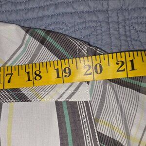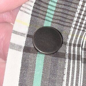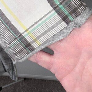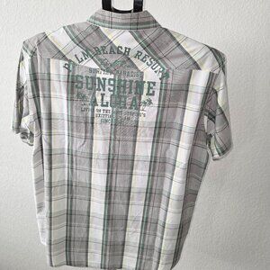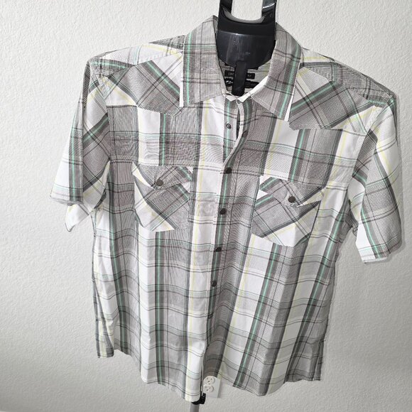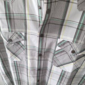 BOSSINI CONTEMPORARY FIT MENS XL GRAY, GREEN AND WHITE PLAID WITH SNAPS AND 2 POCKETS WITH FLAPS SHORT SLEEVE SHIRT. PLEASE SEE PICTURES.