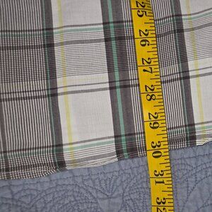 WHITE BACKGROUND WITH GRAY AND GROUND PLAID WITH YELLOW STRIPE. WITH A PRINTED BACK. NICE SHIRT. SEE PICTURES.