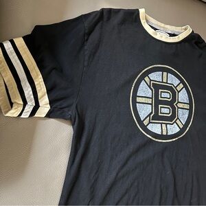 Boston Bruins short sleeve T-shirt official NHL merchandise by Red Jacket size Mens Large, Crafted in India. Black/yellow/white, soft 100% cotton material, sewn striped sleeves, front screen print logo, sewn patch logo left sleeve. Approximate shoulder width 19”, length 26”, chest width 20”, shoulder to armpit 11”. Good condition, washed never worn.