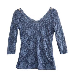 Boston Proper blue lace top women’s medium empire waist romantic date night evening blouse stretch spandex nylon rayon elegant feminine chic