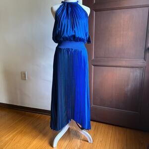 BOSTON PROPER | Blue Pleated Charmeuse HIgh Neck Midi Dress
