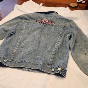 BOSTON PROPER Ladies SZ 8 Jean Jacket. Great condition, barely worn. Button up. Harley Davidson Patch on the back Gray, Red and Black with bling heart.