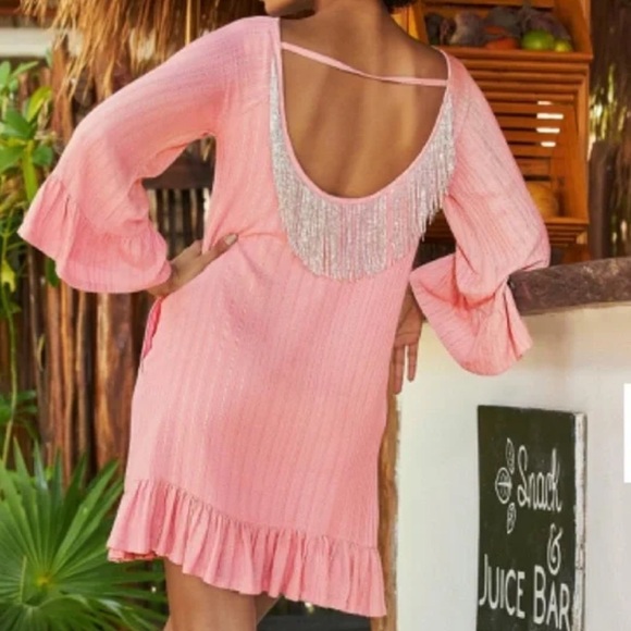 BOSTON PROPER Pink Gold Embellished Beaded Fringe Mini Dress Size S Vacation