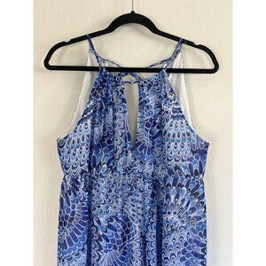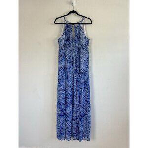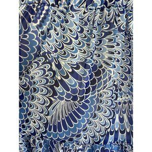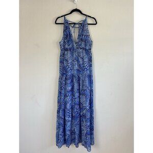 BOSTON PROPER Size 10 Boho Summer Peasant Tiered Maxi Dress Blue Feather Print
