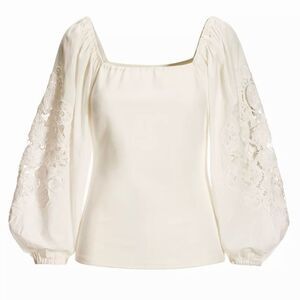 As a staple top with added flair, this essential ponte knit pairs up to any pant flawlessly. The statement-making embroidered sleeves and square neckline create a voluminous, flattering, feminine look that elevates the everyday.