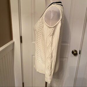 BOSTON PROPER V-NECK SWEATER WHITE BLACK CABLE KNIT COLD SHOULDER PREPPY SIZE S