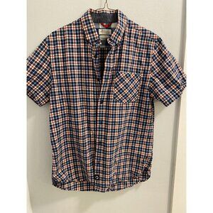 BOSTON TRADERS MENS PLAID BUTTON DOWN SIZE SMALL. RED WHITE & BLUE PLAID. SHIRT IS IN PERFECT CONDITION.