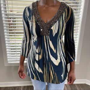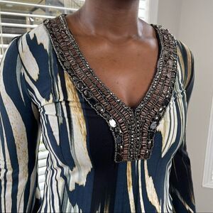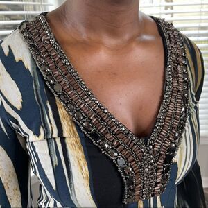 BOSTON PROPER Beaded Neck Print Blouse Top