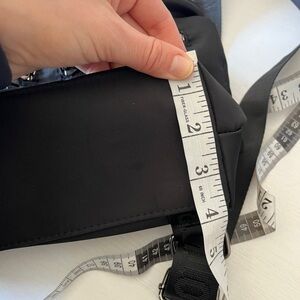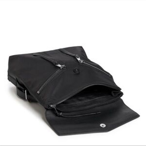 Light wear on this grown-up take on a back pack. Pebbled faux leather top, branded adjustable straps, two zip pouches on front with one internal pouch (no zip).