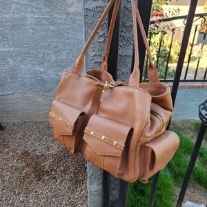 Gold brass accent details and a lobster clasp to close and accent the bag.
