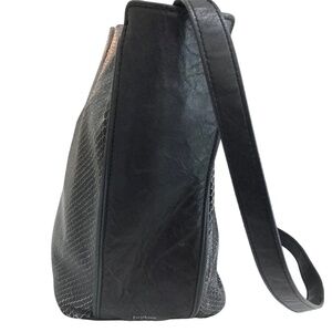 - Black leather sides and bottom, snake embossed black leather front and back panels.