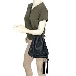 BOTKIER Snake Embossed Black Leather Tassel Drawstring Crossbody Bucket Bag