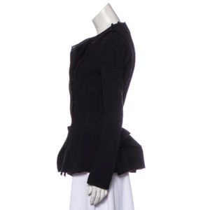 Black Bottega Veneta double-breasted crepe jacket with raw-edge trim throughout, scoop neckline, long sleeves, pleating at back and snap closures at front.