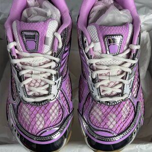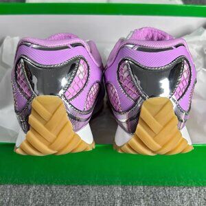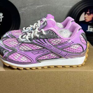 Step out in style with these Bottega Veneta women's sneakers. Featuring a vibrant pink and silver design, these shoes offer both comfort and fashion-forward flair. Perfect for any casual outing.