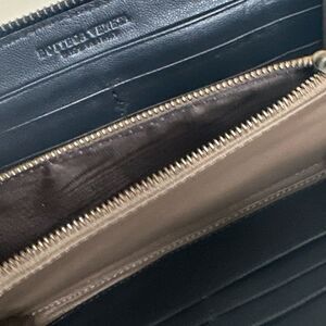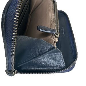 Navy Leather Wallet is gentle worn. Made in Italy. Wallet has zipper access to inside of wallet has alot of space.
