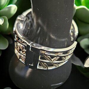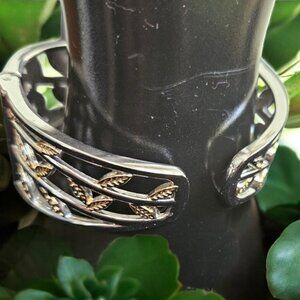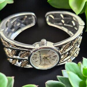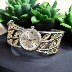 BOUSSIVIE Goldtone Leaf Ladies Hinged Clamper Quartz Cuff Bracelet Watch