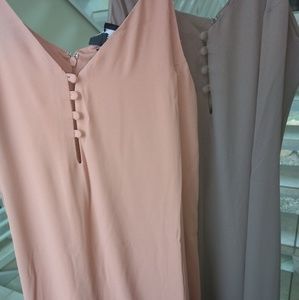 LIGHT BLUSH SPAGHETTI STRAP MAXI DRESS. BUTTON DETAIL ON FRONT. ZIPS AT TOP BACK. DRESS IS LINED. I LOVE THIS DRESS BOTH FOR THE BUTTON DETAILING IN THE FRONT AND THE LOVELY FABRIC THAT FALLS JUST RIGHT! FABRIC IS CHIFFON (POLYESTER)