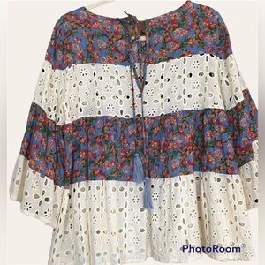 Super adorable blouse purchased at a local boutique. Blue/red/tan floral pattern fabric with cream eyelet tiers. Long flare sleeves, tie closure at top back. Hands down a favorite in my closet!! This has been worn 1-2 times, hand washed carefully and line dried.