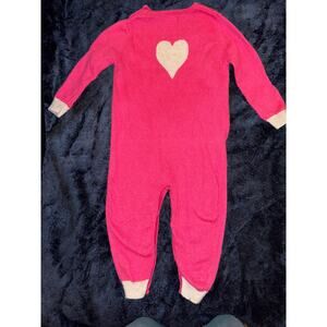 70% COTTON, 30% CASHMERE SUPER SOFT BARBIE PINK ONESIE. PEACE SIGN ON FRONT AND HEART ON BACK. FOR 18-24 MONTH OLD BABY.