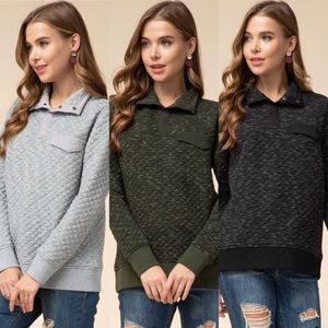 Quilted pullover high collared long sleeve sweater featuring a snap closure detail at the neck, front pocket at the bust. Non-sheet. Woven. Lightweight. Almost identical to the Patagonia Pullover that retails for $150 😳!