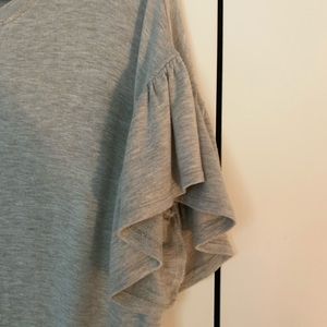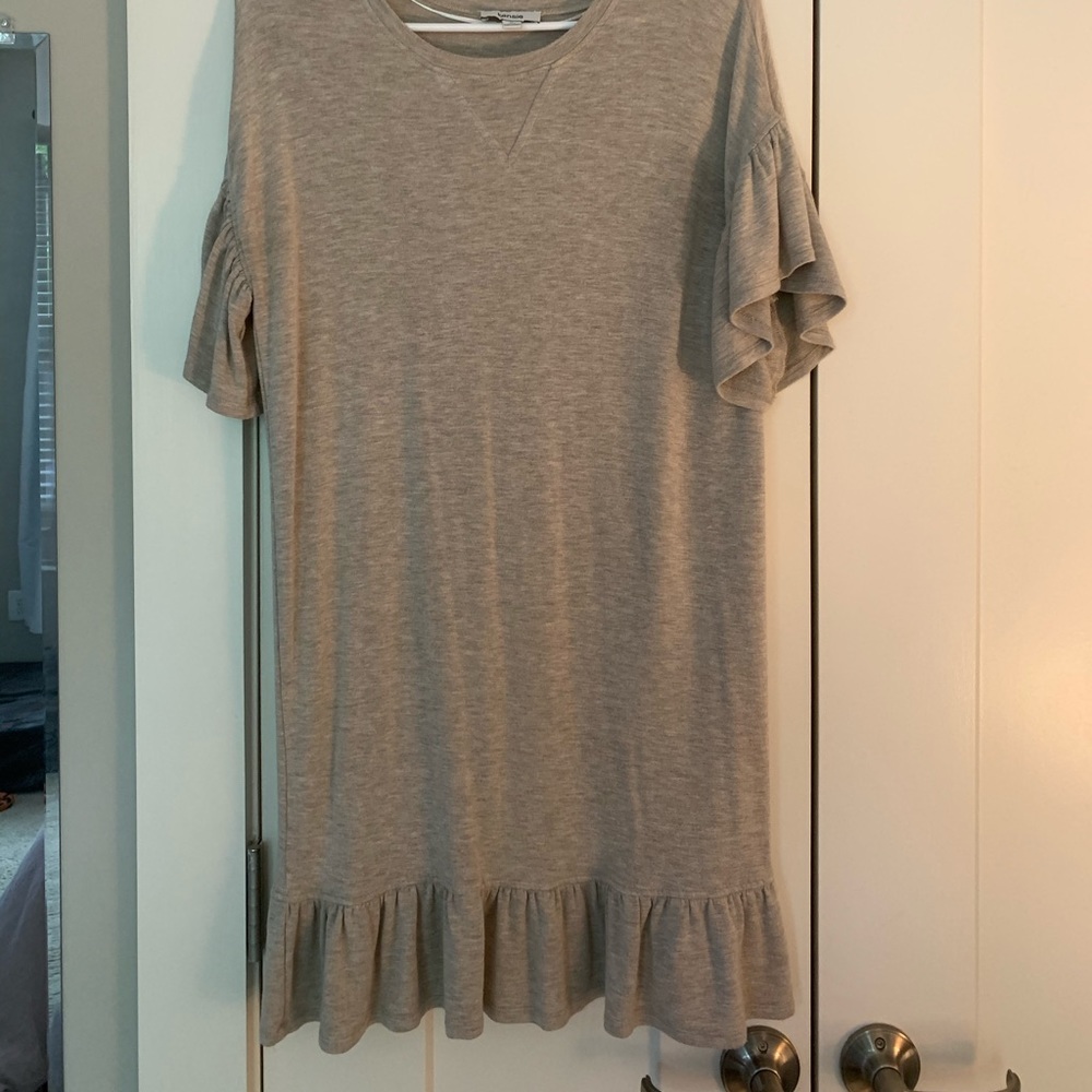 Perfect ruffle detail dress perfect for spring. Ruffle detail on sleeves and bottom. Jersey cotton