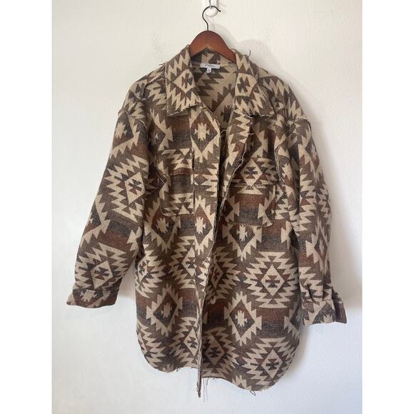 BOUTIQUE Tan Boho Aztec Print Raw Hem Oversized Long Shacket