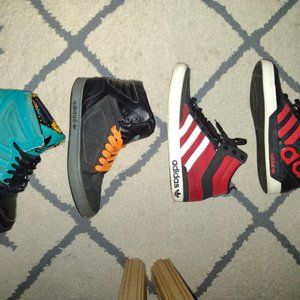 TEN PAIRS OF ASSORTED ADIDAS HI TOP SNEAKERS SIZE 8.5, 9 AND 9.5.THIS IS A LOT NOT SOLD SEPARATE. ADD $35.00 TO SHIP THIS BOX TO YOUR TOTAL.