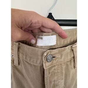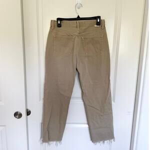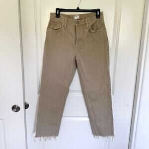 The Tommy is a high-waist rigid, straight leg jean in a vintage khaki wash called "The Crowd". It has a button fly, raw hem, and is made entirely from upcycled and organic cotton.