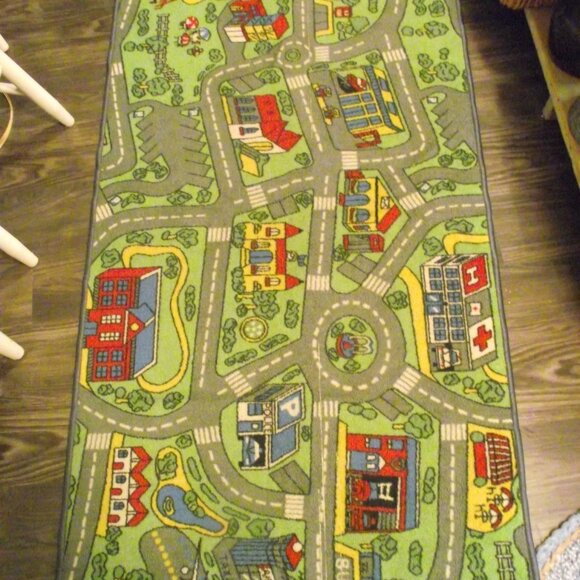 58 1/2" x 31 1/2" (approx. 5' x 3') This rug has the coolest layout for a boy to drive cars all around on. Lovely town images and bright colors. There is a snag in two places where the yarn got tugged out. This is more evident from the back side than the front, so it's barely visible on the carpet side.