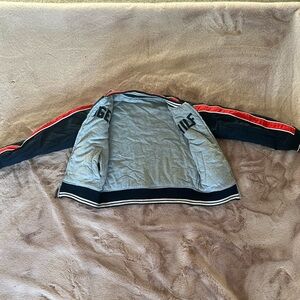 Kids tommy hilfiger jacket Blue side of jacket has a windbreaker material and the gray reversed side is a cottony material Reversible bomber jacket grey and navy and converts into red white and blue jacket when flipped Size- kids XS (4-5) Great condition no rips etc but minor marking on the sleeve shown in last pic Adidas puma champion new balance reebok gymboree Tommy Hilfiger Nike reversible jacket hoka GAP Abercrombie and fitch children’s place cat and jack