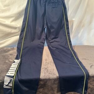 Boys puma sports lifestyle pull up sweatpants casual track color is navy blue with lime, green stripe puma written on the bottom part of the leg. Never worn tags removed and washed in excellent condition.
