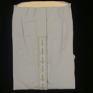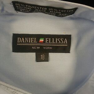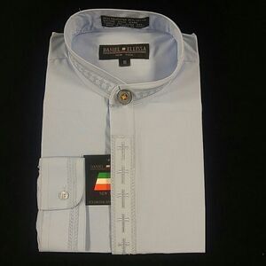 Boy's banded collar dress shirt with convertible cuffs. It can be buttoned or use cuff links. Fashion button at neck closure. Light blue broadcloth fabric with crosses on front placket. 65% polyester 35% cotton. Boy's size 18.