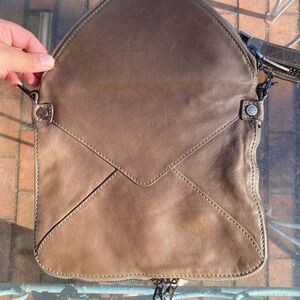Angled zip pocket at back and under flap.