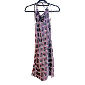 BP BE PROUD Gender Inclusive Cowl Neck Satin Dress In Purple Liza Print Size M. A geometric print brings groovy dimension to this silky-smooth satin dress topped by an elegant halter-style cowl neck and matching cowl open back. 100% Polyester.