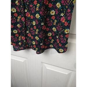 BP black flower pink yellow collared button up semi sheer blouse in good condition. Ruffle cap sleeve. Rounded hemline Business casual casual day trip vacation