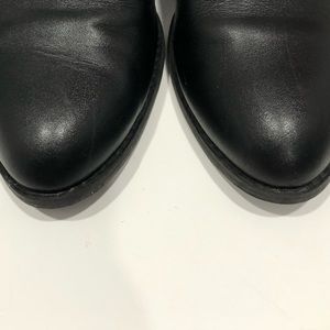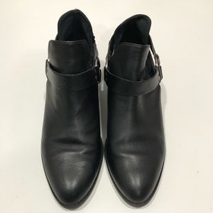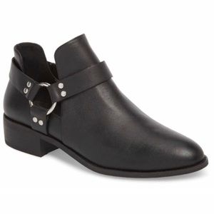 Excellent condition. Brass Plum (Nordstrom) black leather motorcycle ankle boots with a silver harness buckles at each side for that edgy Moto look. Genuine leather, pull on style, almond toe. Very slight marks on one of the heels. Heel height is approximately 1.5”, shaft 3”.