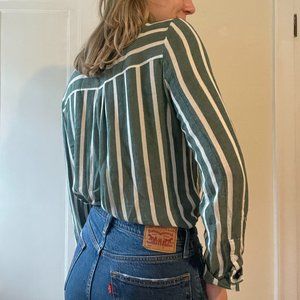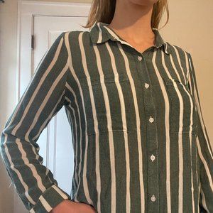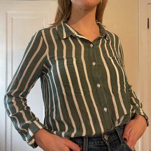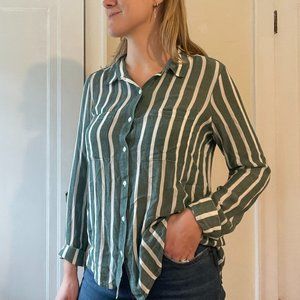 This trendy BP button-down is perfect for adding a touch of preppy style to your wardrobe! The vertical sage green and white stripes are classic and flattering, and the relaxed fit (size medium) is comfortable and versatile.
