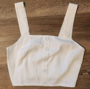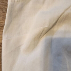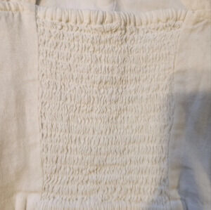 Linen/ Rayon blend with smocking in back. Faux buttons in front, no flaws.