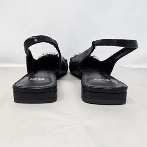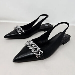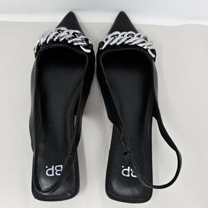 BP. Camille Black Faux Leather Sandels Sz 6M Sling Back Silver Tone Chain Bit
