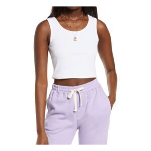 BP from Nordstrom Classic Cropped White Tank Top in a Smooth Knit. The abbreviated hemline adds to the stylish charm, it is a versatile shirt that can be worn solo or layered up. It has a Scoop Neck, it is Sleeveless, has Wide Straps and is Cropped.