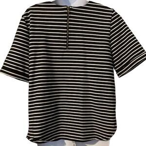 Features: black and white medium weight cotton feel, short sleeves, scoop neck with jeweled neck line all jewels intact, zipper 1/3 down back of top , versatile piece, great shape, worn a few times and dry cleaned.