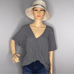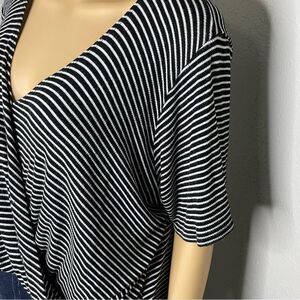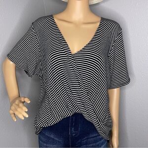 BP Deep V Neck Faux Wrap Draped Short Sleeve Striped Blouse Black White Sz Large