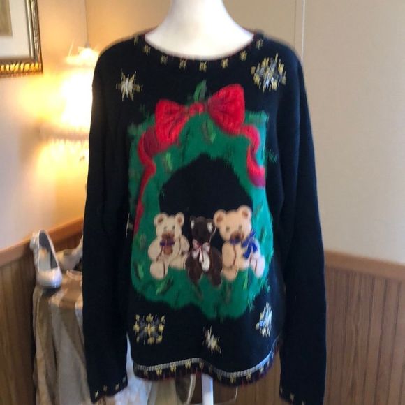 Adorable designer warm long sleeve sweater b.P design with three adorable Teddy bears. X size large. Great condition might need a sweater shaver on the bears