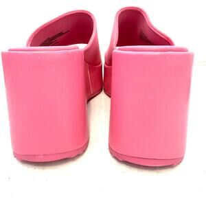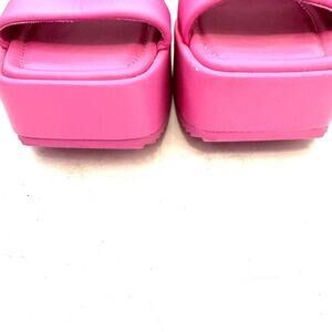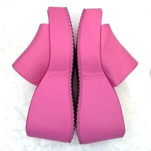 Good used condition! Chunky platform slip on sandals. Thick foot strap in hot pink with a square toe. Back platform height of 3.5 inches. Front platform height of 1.5 inches